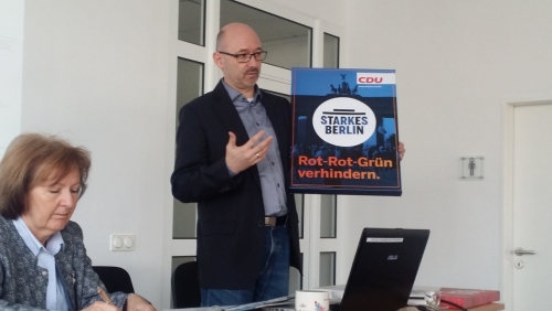 Eden izmed plakatov v nekdanji predvolilni akciji - za močnejši Berlin. [/caption]Da pa je teden minil brez težav, organizacijsko dovršeno ter da so se sporočila iz enega jezika v drugega prenesla točno, moram najprej omeniti dr. Mihaela A. Langeja, predstavnika KAS Zagreb, ki nas je vodil po mestu in delil znanje tako politike kot nemške zgodovine. Druga oseba, brez katere bi težko razumeli koga od govorcev, je dr. Božica Kitičić Prunč, prevajalka, ki obvlada slovensko, hrvaško, nemško in ji ni para. Koliko besed in stavkov je bila zmožna vtisniti v spomin in jih prevesti do besedice točno. Jo močno priporočam kot prevajalko.
