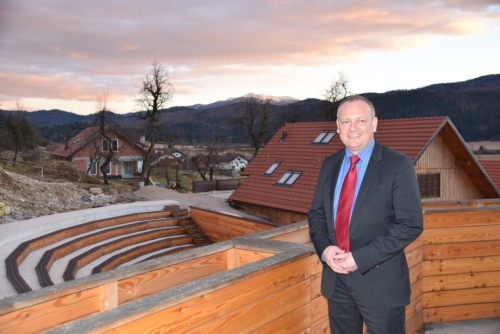 Mag. Zidanšek, v ozadju pa letno gledališče Zavoda Ars Viva in zasnežen Snežnik.[/caption]
