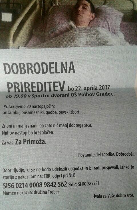 Mlad 17-letni Primož se je v prometni nesreči hudo poškodoval. Od septembra 2016 leži v UKC Ljubljana in negibno čaka, da mu kdo pove, kaj se bo zgodilo … Bo še kdaj lahko obrnil glavo, se usedel, samostojno jedel, hodil? Bo vse življenje hrom od vratu navzdol? Vse, kar ga trenutno drži pokonci, je sposobnost govora in razmišljanja, ki sta hvala Bogu ostala neprizadeta. Oh, kakšna volja do življenja. Pridem na obisk in mi z nasmehom pove, da je naredil 28 vdihov samostojno, brez aparatur. Izvem, da je začel čutiti nekatere dele telesa. Premikati jih ne more. Dogodek je družino pretresel in prizadel. Vsak dan upati na najbolje, biti notranje boje in hkrati ostati močan, je vse prej kot lahko. Vsak posamezni član družine mora biti trden, drugače se bodo porušili kot domine. Trenutno rehabilitacija na Soči v Ljubljani ni mogoča, ker Primož ne diha samostojno. Družina je podala vlogo za rehabilitacijo v tujini in trenutno se še ne ve, kdaj bo. Ne glede na vse, je nujno potrebna takojšna rehabilitacija na domu. Ob sami misli na samoplačniško rehabilitacijo-fizioterapije, adaptacijo hiše in vse, kar bo še sproti prišlo, je ne glede na vse hud psihičen pritisk in hkrati finančna stiska. Novica, da pride aprila Primož domov, je prinesla veselje, a hkrati neizmeren strah. Kam postaviti posteljo za nego? Kako bo mama zmogla biti na voljo 24 ur na dan, vsak dan? Zakaj … Kako … Kdo … Koliko … Sama vprašanja. Ni odgovorov.
