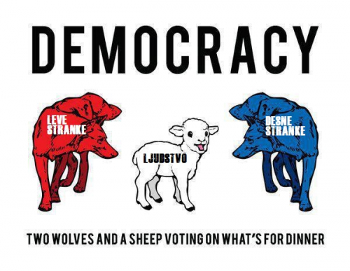 "Volilna pravica v demokraciji torej pomeni, da lahko greš na volišče in oddaš svoj glas določenemu kandidatu, da odloča namesto tebe ali pa da ne greš in ne daš nobenemu kandidatu svojega glasu, ker noben kandidat ni vreden tvojega zaupanja"!