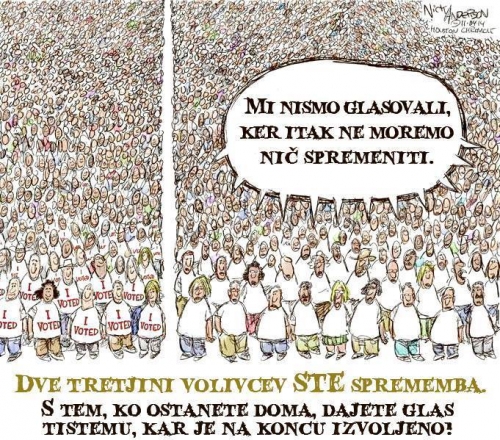 Kdor ne gre na volitve (ki so farsa pri obstoječi volilni zakonodaji) s svojo državljansko nepokorščino dokazuje, da ima svoj obraz in glavo ter je generator sprememb nedemokratičnega družbenega sistema, ki se iz poštenih in delovnih ljudi norčuje, jih zlorablja in izkorišča, zato jasno izraža svoj upor zoper oblastniško tiranijo!