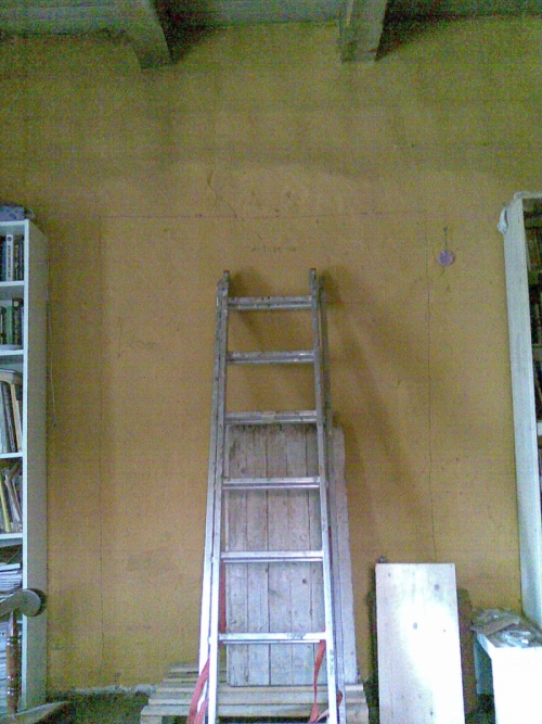 Na tej sliki je lepo viden apneni omet, s katerim so včasih ometavali butane hiše. Odprtino za okno sem približno narisala (145 x 205 cm), z zunanje in notranje strani, kopala pa sem od zunaj, saj se glina zelo praši in nisem želela o nepotrebnem prašiti notranjosti.