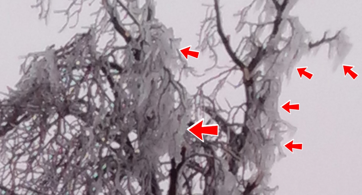 Na vseh fotografijah lahko vidiš, da se je led neglede na temperature zraka, ki so med tednom nihale od -3 do +3 vedno nabiral na vejicah zgolj zgoraj, kapljice niso imele časa, da bi se kot je bilo običajno nabirale na spodnji strani vej in formirale svečke. Več kapljic dežja mi je zaradi burje padlo tudi v oči, zaradi česar so me dalj časa oči pekle, kar se ob običajnem dežju kaj takega ni dogajalo nikoli doslej.