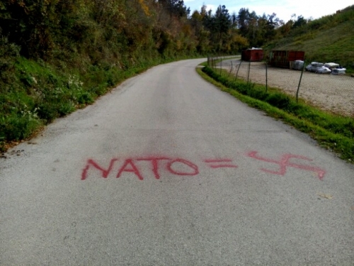 Pa še fotka iz lanskega leta, ki mi jo je poslala prijateljica, kaj si o "naši" NATO vojski misli večina Postojnčanov. Na cesti, ki vodi v NATO vadbišče Poček-Bače je bilo več takih znakov NATO=kljukasti križ.
