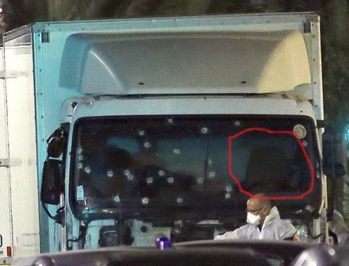 Zanimiva je fotografija vetrobrana tovornjaka, kjer so se potrudili, da so prestrelili steklo povsod, samo tam ne kjer je volan, za katerim je sedel ISIS "terorist"