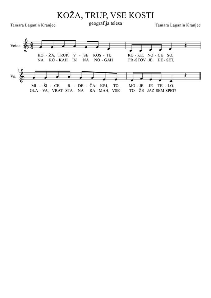 Skozi pesmice smo si ogledali različnost teles, jutranjo higieno in umivanje, geografijo telesa - dele telesa, čutila, posebno jeziček, zobke in kako zob zrijemo, kako obvežemo manjšo rano, nekaj prstnih iger, zdravje telesa, kako jemljemo zdravilo ...