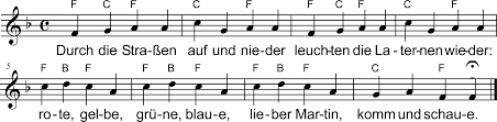 Vielerorts ziehen Kinder am Martinstag von Haus zu Haus und singen Martinslieder. Hier nun ein solch typisches Umzugslied mit dem Kinder um eine kleine Gabe bitten. Die Kinder bekommen dann meist Süssigkeiten, Obst, Nüsse und auch schon mal Geld.