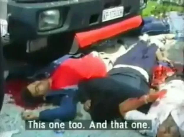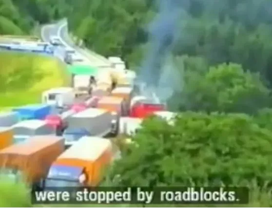 Zaustavljena kolona civilnih kamionov, ki sta jo raketirala dva jastreba JA. Po čigavem povelju in kdo je plačal tudi to vojno škodo ter odškodnine svojcem pobitih dveh novinarjev in ranjenih voznikov kamionov?