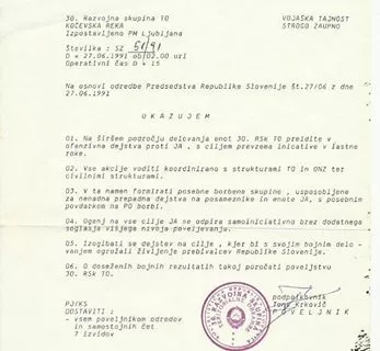 V ukazu za bojna delovanja enot TO, ki je bil podlaga tudi za sestrelitev helikopterja tipa gazela s pilotom Mrlakom in mehanikom na krovu, jasno piše, da je bil izdelan "na osnovi odredbe Predsedstva Republike Slovenije št. 27/06 z dne 27.06.1991". Izdan je bil ob 02.00 uri tega dne.