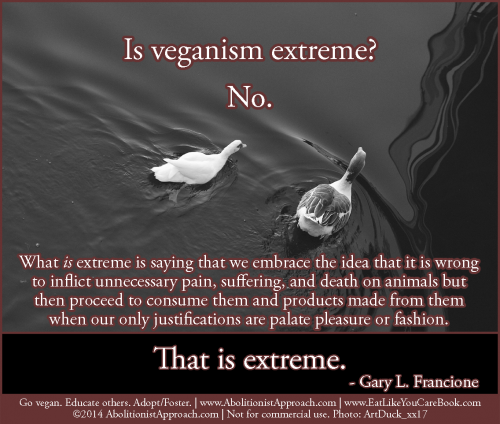 - “Being vegan is not just a matter of being ‘kind’ to animals. First and foremost, it is a matter of being just and observing our moral obligation to not treat other sentient beings as things.”