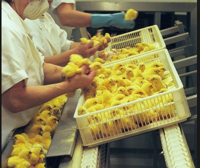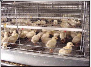 En ali dva dni stare piščančke ženskega spola se pošlje na farme, kjer se jih redi v kletkah ali talni reji. Nikoli nimajo stika s svojimi materami.