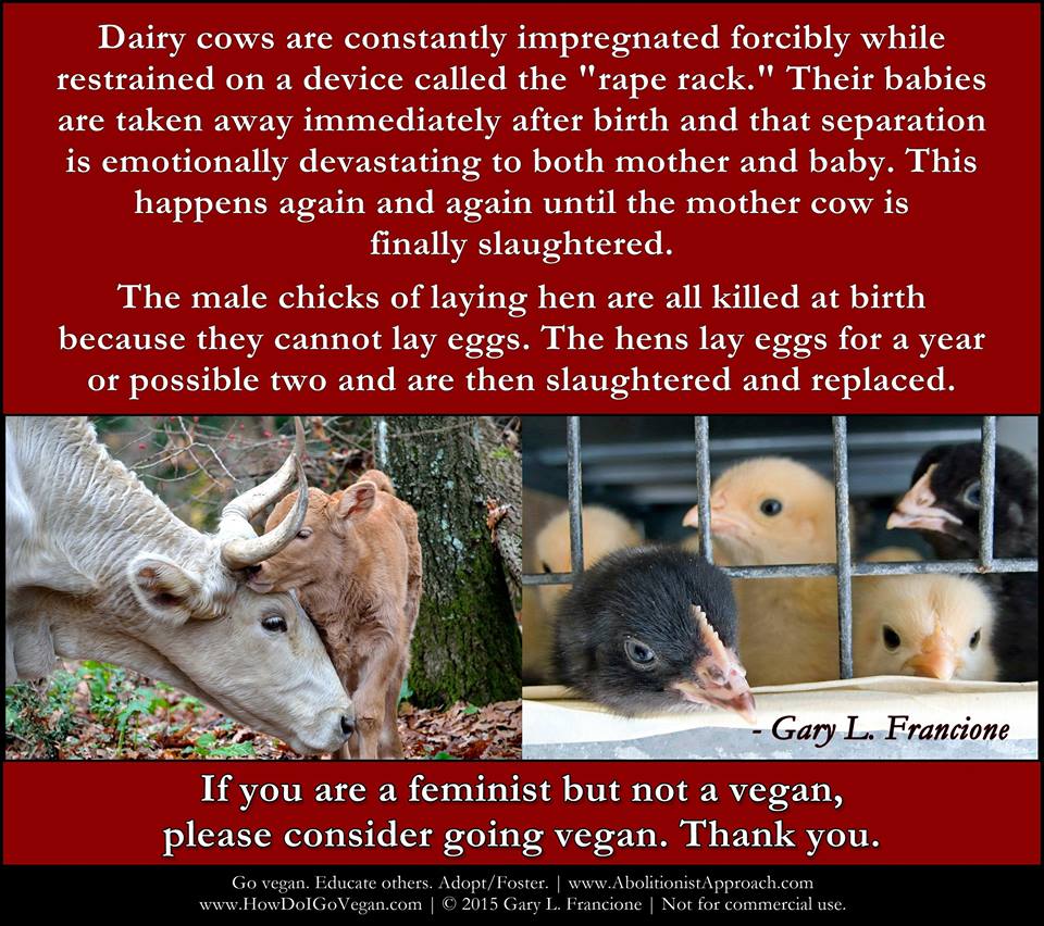 Če ste feminist in vegetarijanec, a še vedno uživate mlečne izdelke ali jajca, delate umetno ločnico med človeškimi in ne-človeškimi živalmi.