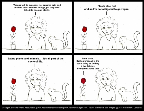 Ženska: »Vegani mi razlagajo o tem, da bi morali prenehati povzročati bolečino in smrt drugim čutečim bitjem, toda pozabljajo na rastline. Rastline tudi čutijo, zato nisem dolžna postati veganka. Jesti rastline in živali ... vse to je del življenja, krogotok prehranjevalne verige.«