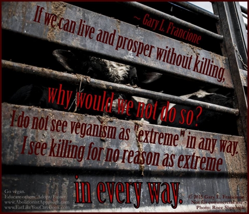 Če so živali moralno pomembne, potem veganstvo ni le ena izmed možnosti - je nuja. Vsaka organizacija, društvo ali posameznik, ki trdi, da pripada gibanju za pravice živali, mora zavzeti jasno stališče, da je veganstvo moralni imperativ.