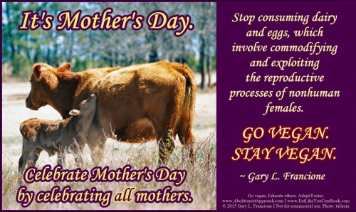 Zato danes, ko slavite materinskost, razmislite o trpljenju in smrti, ki ju podpirate le zato ker uživate v okusu mleka, sira, masla, jogurta, smetane, sladoleda, mlečne čokolade, itd. Razmislite o tem kaj to pomeni za krave, nežne matere, ki jih izkoriščamo. Vprašajte se, če je vredno. Če vaše srce pravi »ne«, postanite vegan. Obstaja veganstvo in obstaja izkoriščanje živali. Tretja možnost ne obstaja. Če nismo vegani, potem osebno sodelujemo pri popolnoma nepotrebnem okoriščanju na račun ranljivih in nemočnih.