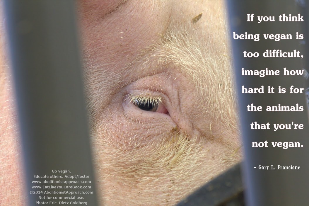 4. Abolicionistični pristop pogojuje moralni status živali izključno s sposobnostjo občutenja, in z nobeno drugo kognitivno lastnostjo. Občutenje je subjektivna zavest: obstaja nekdo, ki zaznava in doživlja svet. Čuteče bitje ima svoje interese; se pravi, prioritete, potrebe ali želje. Če je bitje čuteče, to zadostuje, da ima pravico ne biti uporabljeno kot sredstvo za dosego človekovega cilja, kar vzajemno nalaga človeku moralno zavezo, da ne uporabi to bitje kot svoj vir. Ne priznavamo "humanega" izkoriščanja živali. Čeravno je manj trpljenja boljše kot več, nobena oblika izkoriščanja ne more biti moralno upravičena.