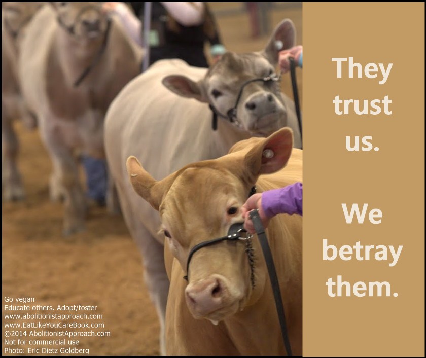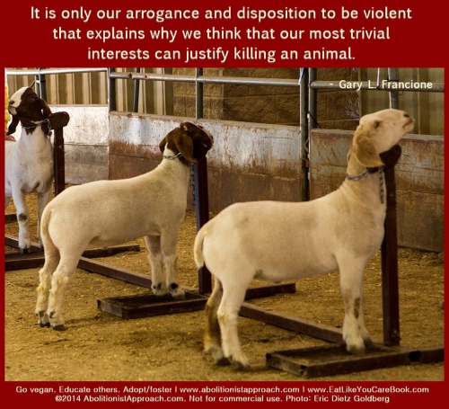 1. Abolicionistični pristop zavrača vsakršno uporabo živali ter zagovarja načelo, da imajo vsa čuteča bitja (človeška in ne-človeška) temeljno pravico ne biti obravnavan kot lastnina drugega.