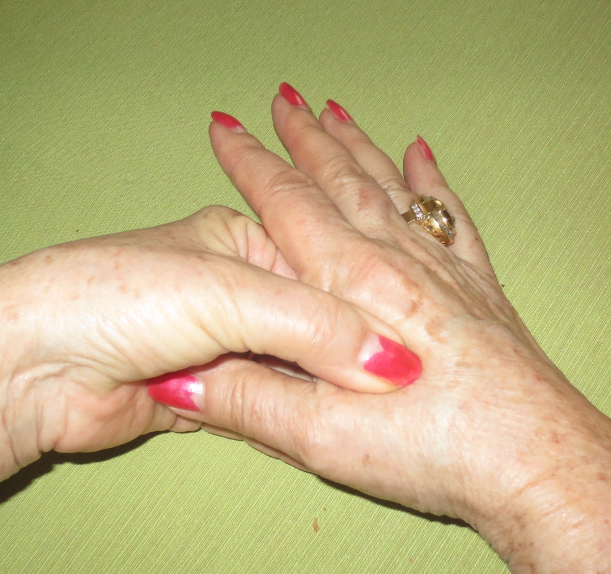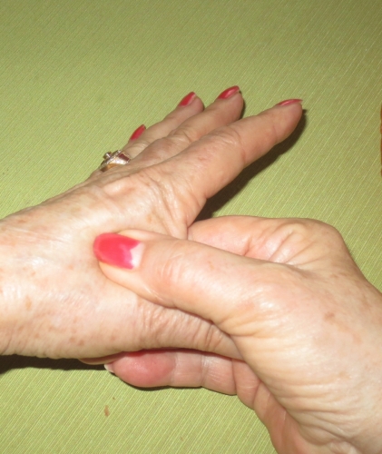 Ta oprijem mi je svetoval znani igralec golfa, ki me je opazoval pred tekmo. V meni je zaznal veliko napetost in me je prijel za roko. Na videz sva se poznala zato sem mu dovolila oprijem roke. Ko me je stisnil med „ praznim prostorom sladke točke“ med palcem in kazalcem sem zatulila od bolečine. Nisem imela priložnosti javkati, takoj je pograbil še drugo roko in bolečina je bila ista, močna. A sem si mislila: „fant že ve“. Še dvakrat tak oprijem, bolečina je izginila in enako moja napetost. Ni potrebno poudariti, kolikokrat sem si med tekmo še masirala to izredno dragoceno mesto, enako ni potrebno poudariti, da sem bila zelo uspešna tistega dne in še v bodočnosti. Od takrat sem se redno razvajalm s tem oprijemom pred tekmo in pred vsemi odločilnimi trenutki. Vsekakor zelo pomaga, a samo, če ob stisku obeh prstov pošteno zaboli med palcem in kazalcem. Kar naj boli, a s počasnim nategom na izven, a še vedno naj bo oprijem močan bolečina poneha: enako sva napetost v možganih in mišicah. Tudi doma, v službi ali kjerkoli, ko se najdete v napetosti izvedite to masažo, pomaga tudi proti glavobolu, odleglo vam bo. Tudi, če ste dolgo na vožnji, a le prej zaustavite avto na parkirnem prostoru in si privoščite to izredno uspešno akupresuro. Čim bolečine ob stisku ne čutite več, ste na zeleni veji. Srečno.