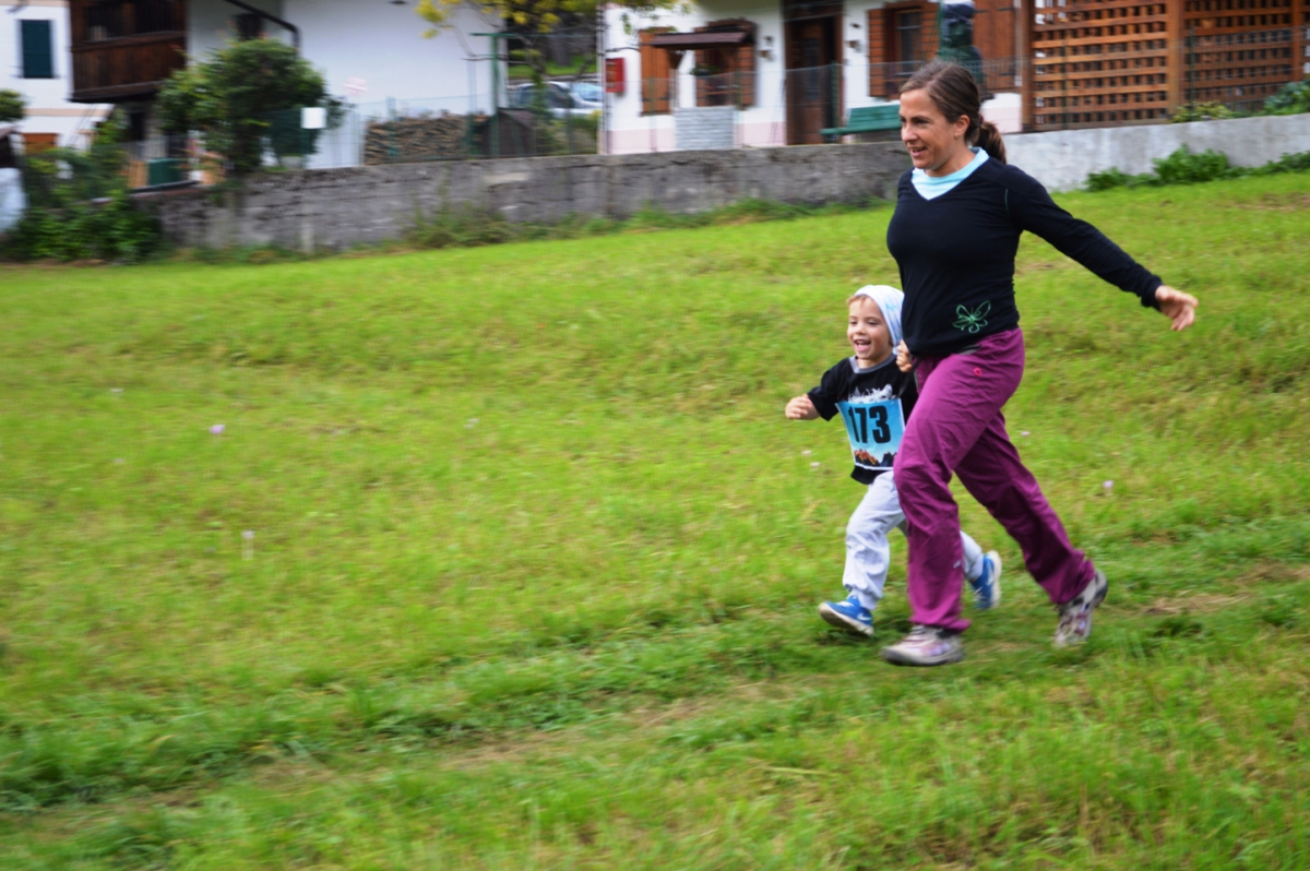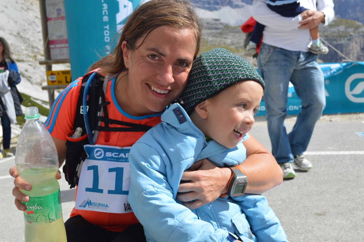 Odvlečem se naprej, ampak Mitja je imel spet prav. Sledijo široke položne poti in ceste, iz metra v meter se bolje počutim. Gledam mogočna ostenja nad sabo in obujam spomine na čase, ko sva z Mitjem preživljala čas predvsem v stenah in skalah. Ni hudič, da se kdaj spet ne naveževa in zaplezava v Dibonov raz, ki naju je enkrat na daleč zavrnil… Kilometri drvijo mimo, šibam mimo koč, prijazno pozdravljam planince, ki veselo navijajo ob poti. Tudi sotekači niso več sovragi, iz nekje celo potegnem par italijanskih besed in sem bolj komunikativna kot v prvem delu. Tek je dobro organiziran, proga je večinoma dobro označena, okrepčevalnice so zadostne in ljudje prijazni. Naslednja okrepčevalnica je na 28. kilometru, 2.600 metrov visoko na koči Pian di Cengia, kjer pade tudi nekaj kapelj dežja, malo se je pooblačilo, a čez kak kilometer, na drugi strani doline, pri okrepčevalnici pred kočo Locatelli, je že spet sončno. Tečemo po lepih stezah nad jezeri, svizci žvižgajo, svet je lep. Spet se zavem, kakšno srečo imam. Lani ob tem času sem posedala doma, iz dneva v dan bolj okorela, nosečnost zame ni tako silno prešeren čas, kot se piše. Tečem že kakih 6 ur, pomislim, da še nisem bila toliko časa ločena od sinčka Mihca. Toplo mi je pri srcu, ko pomislim, da bom kmalu spet s svojimi fanti. Od 36. kilometra se strmo spustimo po ozki poti, globoko spodaj vidim jezero, kjer je cilj. Dobre volje tečem, nič me ne boli, tudi utrujena nisem tako, kot bi pričakovala. Ko pridemo na asfaltno cesto v dolini si mislim, da bom čez slabih 10 minut že na cilju, pa nas pot usmeri na isto blatno pot z začetka zgodbe. Ponovno se »veselim« čofotanja po drsečem blatu in se ogibam kravjekom. Pot se po malem vzpenja in ustrašim se, da sem zgrešila kako oznako. Končno pa puščica desno in olajšano stečem po smučišču, na dnu katerega slutim konec. Takrat dobim SMS od Mitja in ugotovim, da me še kako uro ne pričakujejo v cilju, saj sploh še niso tam! Hiter klic in čez nekaj minut spet zaslišim balzam za moja ušesa, »Dejmo, mama!«. Pograbim Roka in skupaj oddrviva čez ciljno črto. Ura se ustavi pri 7:30.