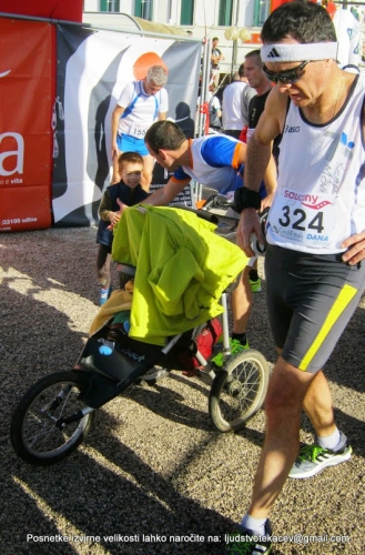 V nedeljo zjutraj pa najbolj kristalno jutro v zadnjem mesecu. Preučimo še radarsko sliko padavin, hitro spremenimo načrte in spakiramo vse (razen psa). Vso pot se čudimo bleščečemu sončku, kot lansko leto naredimo napako in obtičimo v gneči na izhodu z avtoceste, parkiramo 200 metrov od štarta, poberemo številko za Mitja, preučujemo ponudbo opreme (kot ponavadi super čeveljci za 60, 70 evrov) in čakamo na štart. Kakih 8 minut pred štartom pa se glede na toplo sonce in zaspanega Mihca, ki najraje spi v vozičku med tekom, pa še na Mitjeve povsem neambiciozne cilje, v hipu odločimo, da gre na pot tudi Miha. Hitro ga nahranimo in že je start!