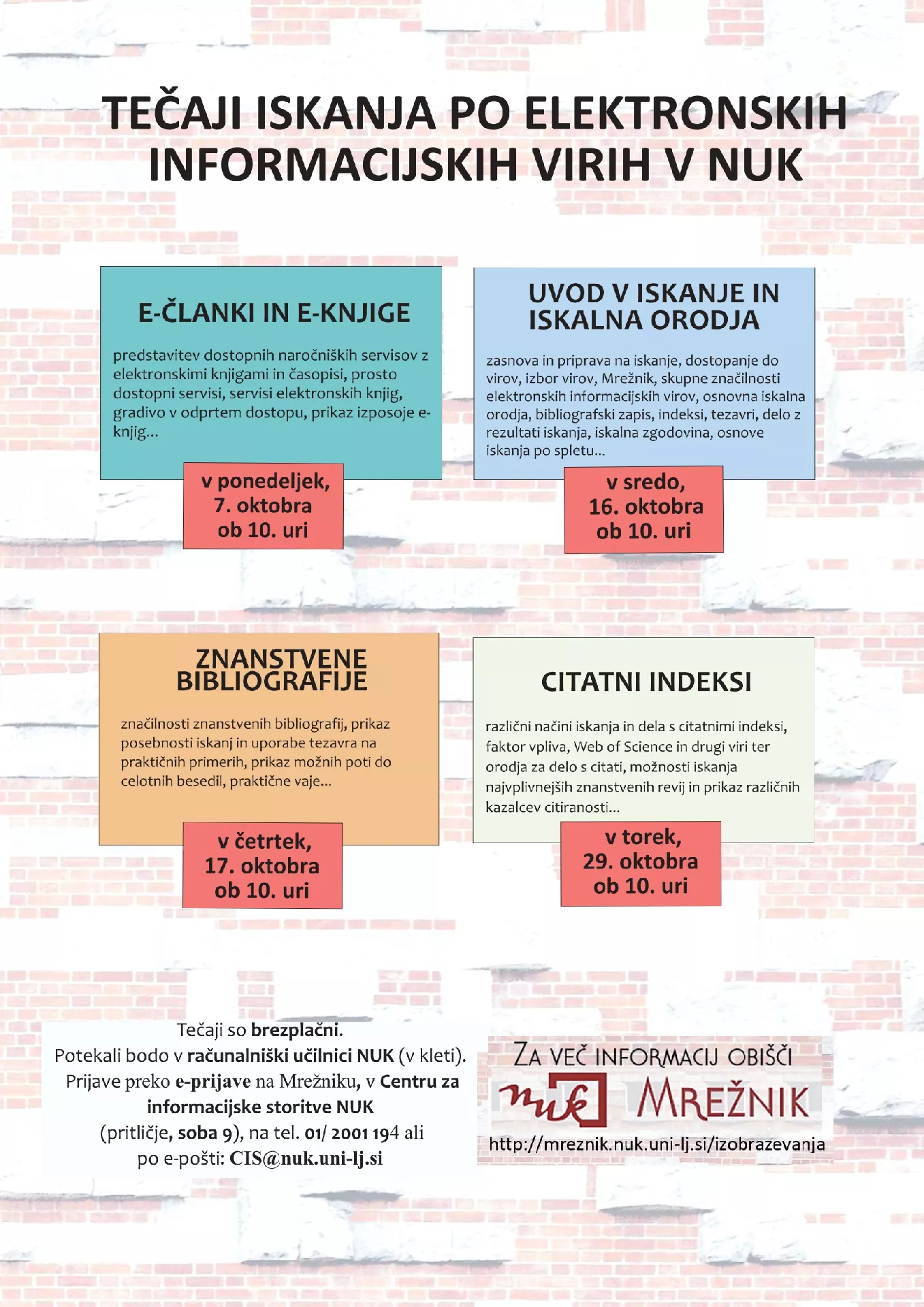 Vabljeni k udeležbi na tečaje iskanja po elektronskih informacijskih virih v mesecu oktobru 2019, ki jih izvaja NUK (Narodna in univerzitetna knjižnica) in so brezplačni. Tečaji bodo potekali v računalniški učilnici NUK (v kleti).