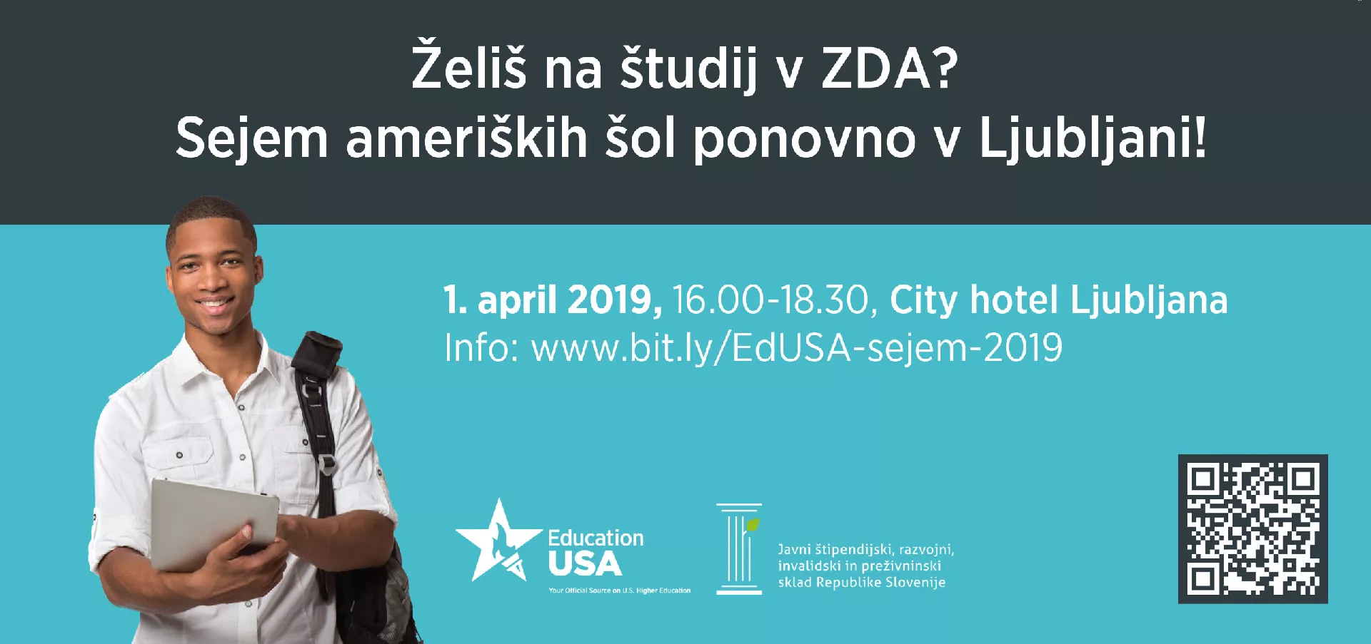 V ponedeljek, 1. 4. 2019, bo v Ljubljani med 16:00 in 18:30 SEJEM AMERIŠKIH ŠOL, kjer lahko izveste več o študiju v ZDA, prijavi, vpisu, štipendijah in še čem. Udeležba je brezplačna.