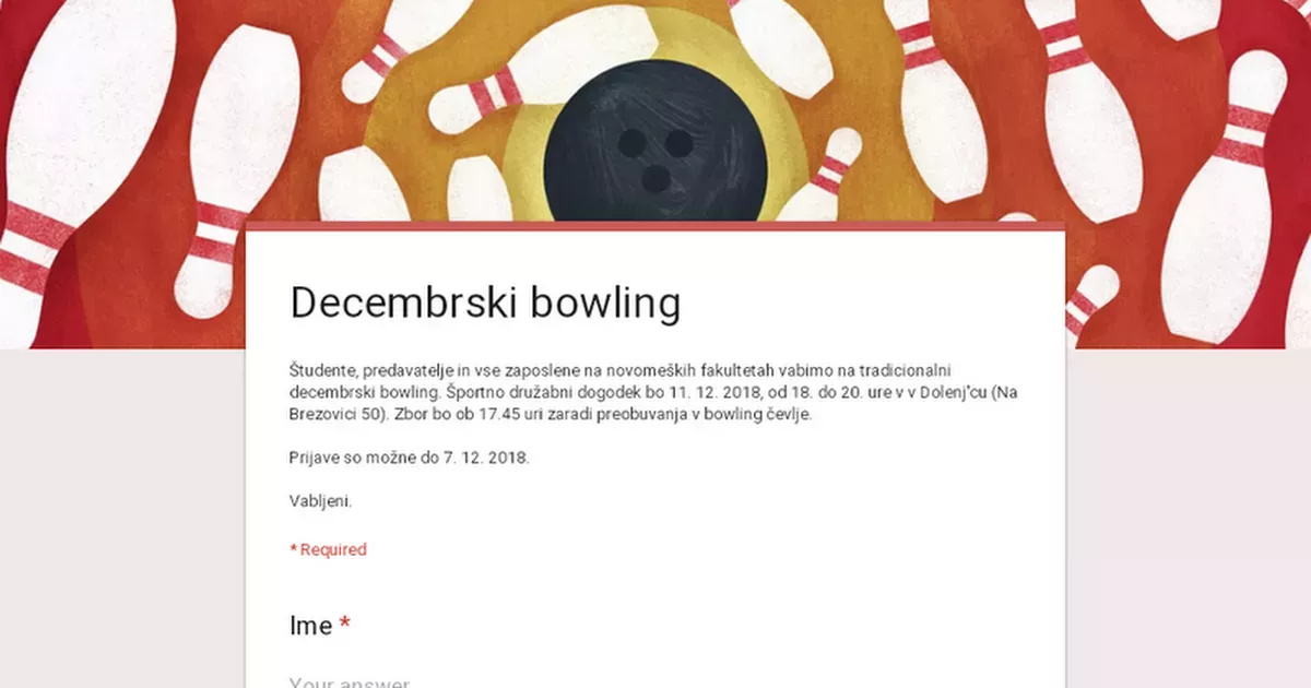 Študente, predavatelje in vse zaposlene na novomeških visokošolskih zavodih (VŠ GRM Novo mesto, FINI, FOŠ) vabimo na tradicionalni decembrski bowling. Športno družabni dogodek bo v torek, 11. 12. 2018, od 18. do 20. ure v Dolenj'cu (Na Brezovici 50). Zbor bo ob 17.45 zaradi preobuvanja v bowling čevlje.