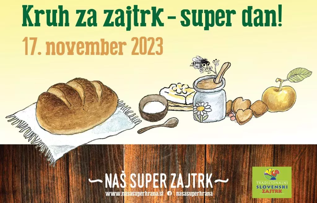 Obveščamo vas, da bo letošnji Tradicionalni slovenski zajtrk 17. novembra in bo potekal pod sloganom »Kruh za zajtrk – super dan!«. Tradicionalni slovenski zajtrk je glavni dogodek dneva slovenske hrane, ki ga obeležujemo že od leta 2012 vsak tretji petek v novembru, zato vas vabimo, da se pridružite obeleževanju Tradicionalnega slovenskega zajtrka.