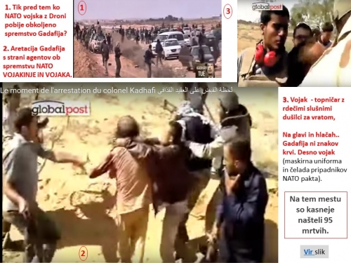 Iz posnetkov se vidi, da so vojaki NATO pakta varovali t.im. IS borce pri izživljanju nad Gadafijem in preostankom njegovih varnostnikov, ki so jih enega za drugim „odstranjevali“. Izživljanje je sadistično bolno, NATO vojaki pa so to ne samo omogočili in dopuščali, ampak so izživljanja celo spodbujali in kazali znake zadovoljstva nad potekom dogodkov.