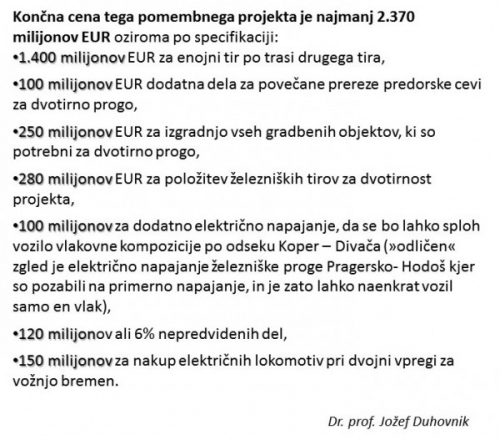 "Vlada je Ministrstvu za infrastrukturo in Direkciji Republike Slovenije za infrastrukturo naložila, da do 31. decembra 2017 pridobita potrebne pravne in strokovne podlage, ki bodo omogočile, da se predviden drugi tir železniške proge Divača – Koper v naslednji fazi nadgradi v dvotirno progo." Vir