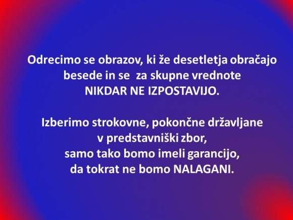 Samo v sodelovanju bomo naredili resnične gospodarske, kulturne ipd preboje. Na neki točki se mora politika umakniti STROKI in to tisti transparentni, preverljivi, ki za odločitve prevzema tudi odgovornost. Tega pa samopašni Miro Cerar s svojo stranko Mira Cerarja… ni uspel zagotoviti.