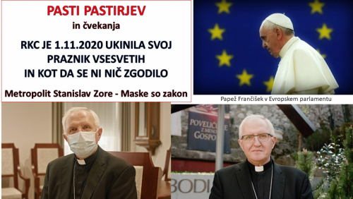 Msgr. Stanislav Zore Ljubljanski nadškof metropolit in predsednik SŠK: »V Katoliški cerkvi 1. novembra obhajamo slovesni in zapovedani praznik VSEH SVETIH. Ta dan bodo maše po vseh slovenskih župnijah, vendar letos zaradi epidemije COVID-19, jih bodo duhovniki darovali brez udeležbe vernikov… Ker veste, da Cerkev živi v občestvu, ste sprejeli tudi nošenje maske. Potolažen sem in pomirjen, ko pridem v različne skupnosti in vidim, da ljudje praktično sto odstotno upoštevate navodila zdravstvene stroke in politike… Bodimo kristjani pri odnosu do vseh teh mnenj med tistimi, ki upoštevajo razum, znanost in strokovnost – in ta nam pravi, da je najboljše zaščitno sredstvo maska in razkuževanje.«