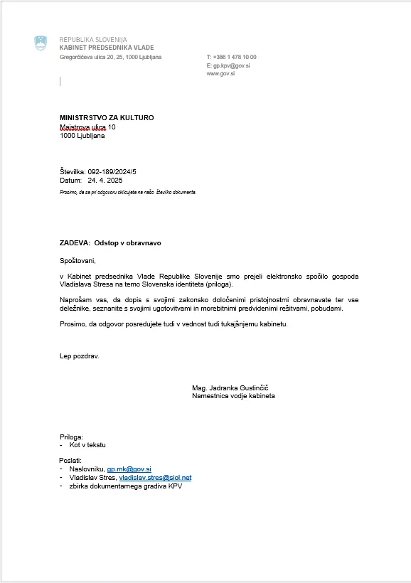 Po večkratnih pritožbah zaradi neodgovora sem 24. 4. 2025 prejel pismo Kabineta predsednika Vlade RS v katerem so kot odgovor na pritožbo 10.04.2025 naslovili pismo na Ministrstvo za kulturo s spodnjo zahtevo: Kabinet predsednika vlade: »Naprošam vas, da dopis s svojimi zakonsko določenimi pristojnostmi obravnavate ter vse deležnike, seznanite s svojimi ugotovitvami in morebitnimi predvidenimi rešitvami, pobudami.«