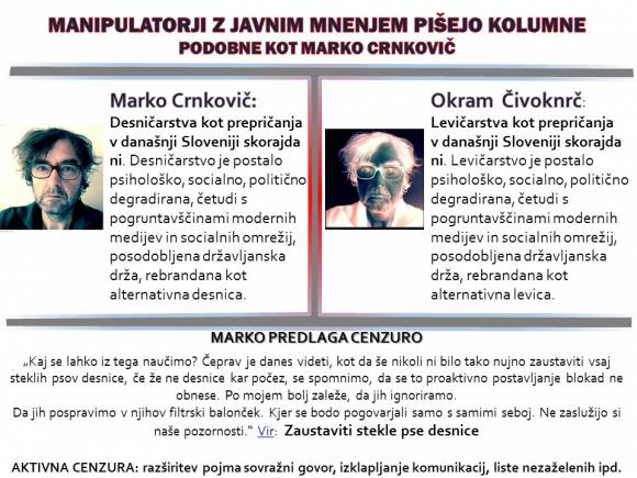 Marko Crnkovič v članku Zaustaviti stekle pse desnice (Vir) (Večer 18.2.2018) širi dezinformacije in podžiga neosnovane delitve med ljudmi. Ti problemi bi se morali reševati po poti novinarskega kodeksa ter popravni poti. Dejstva so tista, ki govorijo o (ne)primernosti javne vsebine.