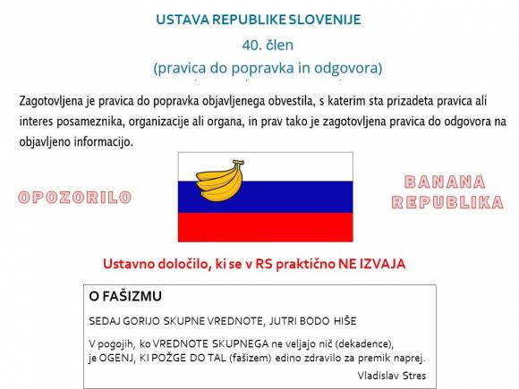 Pravica do popravka in odgovora omogoča uveljavitev poštene, celovite informacije za potrebe javnosti. Ustava torej daje pravico da se LAŽI PREGANJA, da se iztoži povzročena škoda. Ker pa sta pri nas tako levi kot desni politični pol med seboj ZLIZANA, se tako eni kot drugi lahko norčujejo iz državljanov. Pravica je namreč samo zapisana in se, razen za elitnike, ne izvaja. Svobodno novinarstvo služi kvalitetnemu informiranju o informacijah, ki so pomembne za naše razmisleke, odločanja in življenje.