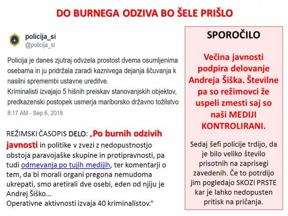 »Policija je pridržala samooklicanega voditelja oborožene skupine Štajarska Vadra Andreja Šiška, pri čemer je glede na cilje, ki jih je skušal doseči je taka, da bi objektivno lahko pripeljala do nasilnega oz. celo brutalnega strmoglavljenja vodstva države.«