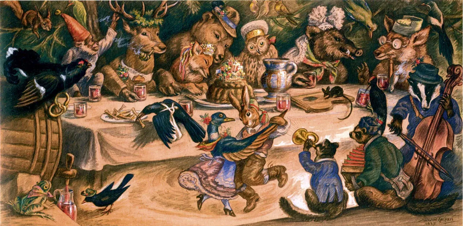 Medvedova svatba, 1937. Slika je nastala za lovsko razstavo v Belgiji.