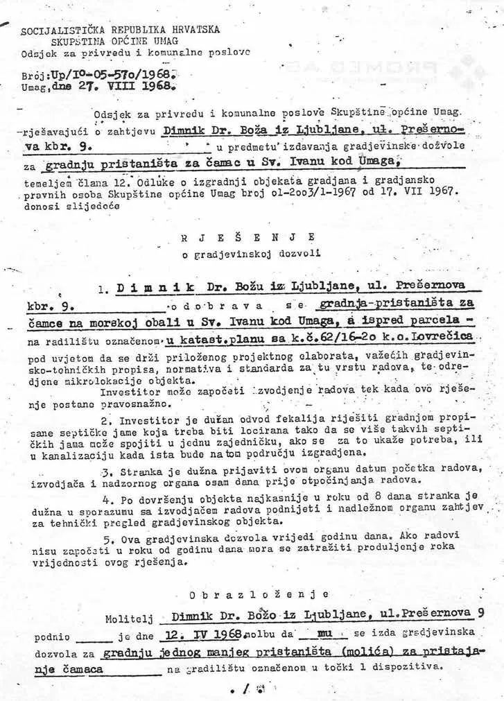 Za pomol sem dobil tako lokacijsko kot gradbeno dovoljenje od kape- tanije Umag in od kapetanije Pulj. Pri tem sta mi pomagali tako policija kot carina, ker sem imel prvi čoln in sem jih z njim včasih vozil okrog. Danes suvereno trdim, da zasebnega pomola s toliko dovoljenji, kot jih ima moj, ni na Jadranu.