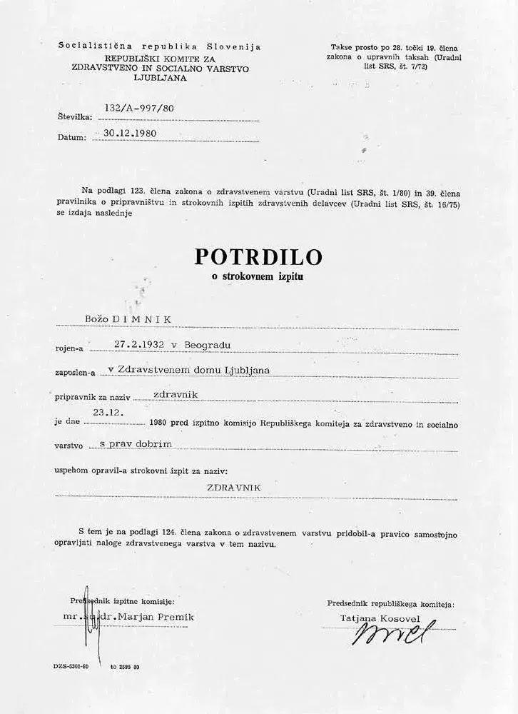 Tudi zaradi tega sem po mnogih letih, in ko mi je bilo že dolgo jasno, da ne bom zdravnik, študij pripeljal do konca, do diplome. Prepričan sem, da devetindevetdeset odstotkov ljudi v mojem položaju ne bi končalo študija, jaz pa sem ga, in to z zelo dobrimi ocenami. Strokovni izpit sem napravil s prav dobrim uspehom. Ni šlo samo za trmo, čeprav sem tak, da nobene stvari ne pustim nedokončane, vsako stvar hočem zmeraj izpeljati do konca. Nisem hotel ostati faliran študent. Kasneje, v osemdesetih, ko sem že imel denar, sem celo razmišljal, da bi se priključil kakšni zdravstveni misiji. Franc Sodja me je nagovarjal k temu. On je šel – bil je na Kitajskem, v Kanadi, v Južni Ameriki – jaz pa ne.