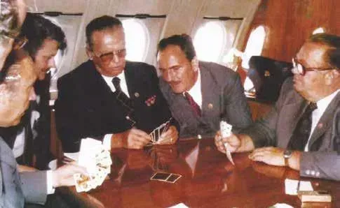 In v tistem, ko sta se onadva kregala, zagledam na komodi ob naši mizi kup slik in med njimi eno, ki je bila posneta na letalu, na njej pa Tito, Dolanc in še nekdo, posnet v profilu, ki mi je bil rahlo podoben, kako igrajo karte.