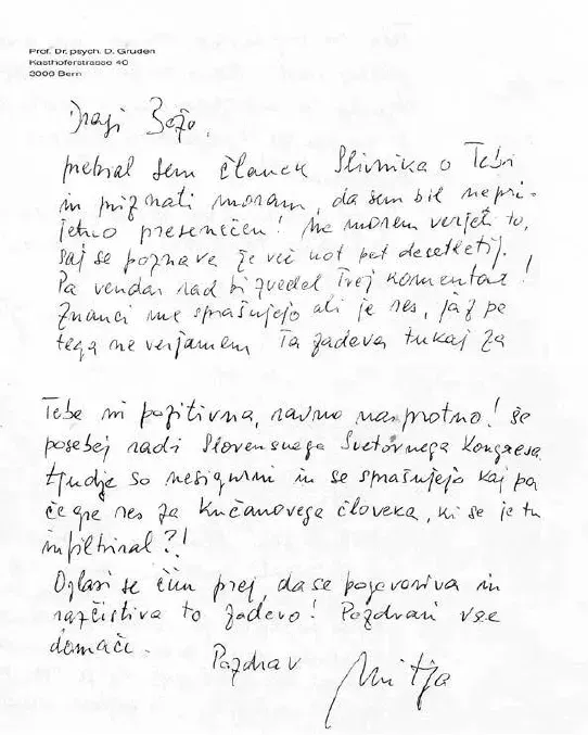 Seveda sem bil sam v opoziciji s sistemom, kakršen je vladal v Jugoslaviji. Ampak ko mi je Weisbrod že leta 1958 ponudil švicarsko državljanstvo, sem ga odklonil, ker mi je bilo to nekako izpod časti. Zdelo se mi je, da bi s tem zatajil očeta. Zaradi tega danes sam sebe ne razumem. Nobene logike ni bilo v mojem razmišljanju, samo čustva. Ko se danes spomnim na tistega Boža Dimnika, ki se je Weisbrodu vljudno zahvalil za ponudbo, me ima, da bi mu rekel: