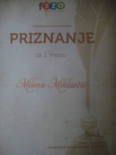 Društvo upokojenih pedagoških delavcev Slovenije že več let zapored- v okviru F3ŽO- poskrbi vse potrebno v zvezi z literarnim natečajem. Na letošnjem 14. festivalu za tretje življenjsko obdobje smo bili v kategoriji odraslih nagrajeni trije: drugi je bil Rudi Mlinar, tretja Ivana Vatovec, prvo mesto je pripadalo moji malenkosti.