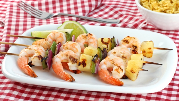 3. Na palčke nabodite košček ananasa, nato 1 kozico, košček čebule, papriko, nato spet ananas, kozico, čebulo, papriko in zaključite s kozico.