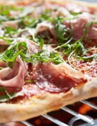2. Premažite eno stran s paradižnikovo omako, potresite z origanom, nato dodajte narezano mocarelo, pršut in rukolo.