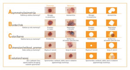 Metoda pregledovanja ABCDE je preprost in učinkovit vodnik za samopregledovanje naše kože. V petih korakih lahko sami s svojim očesom ali s pomočjo svojih bližnjih preverimo, ali je kje na naši koža nastala sumljiva rašča ali pa se katero od kožnih znamenj spreminja. Popoln pregled kože vam bo vzel le nekaj minut časa, lahko pa vam reši življenje. Naredite ga s pomočjo ogledala ali pa naj vam pri tem pomaga partner. V primeru, da opazimo, da se znamenje spreminja (je asimetrično, ima nepravilne meje, spreminja barvo, velikost in obliko) in/ali da srbi, krvavi, da iz njega teče izcedek ali da je podobno rani, ki se nikakor ne zaceli, se moramo takoj posvetovati z osebnim zdravnikom ali z dermatologom.