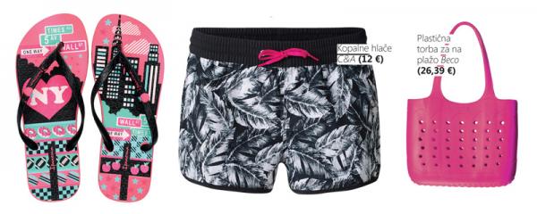 Kopalne hlače C&A(12 €), natikači Ipanema (Modiana; 17,99 €), plastična torba za na plažo Beco