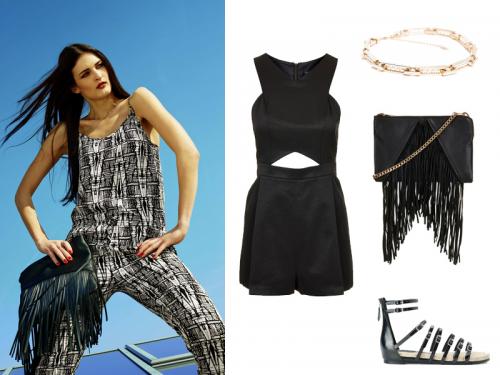 Ann Christine; kratek kombinezon Topshop (73 €), ogrlica Zara (17,95 €), torbica Topshop (58 €), gladiatorke Mango (59,99 €).