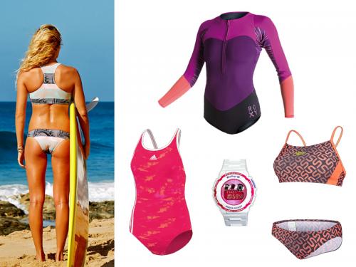 Roxy; neoprenska obleka XY 1mm Bikini Spring Roxy (129,95 €), ženske enodelne kopalke Inf 3S Graphic Suit Adidas (Hervis; € 49,99), ženska ročna ura BABY-G (95 €), bikini kopalke Monogram Speedo (Hervis; 49,90 €).