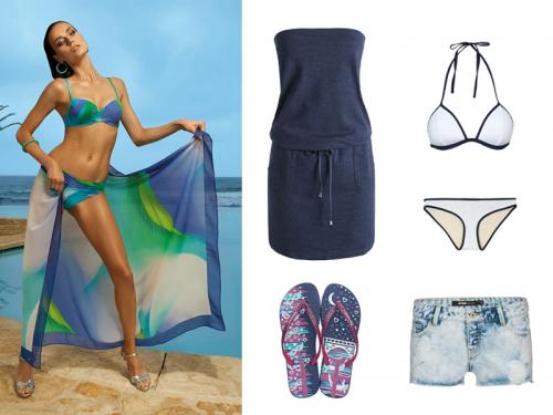 Lisca (dvodelne kopalke 79,00 €; pareo 29,80 €); obleka za na plažo Esprit (44,99 €), bikiniTally Weijl(modrček 12,95 €; hlačke 7,95 €), japonke Unique Ipanema (17,99 €), kratke kavbojke New Yorker(19,95 €).