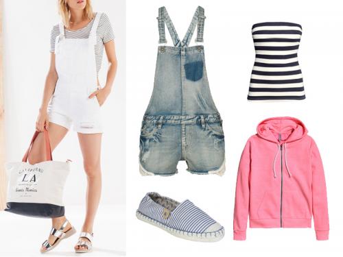 Stradivarius (bele kavbojke na naramnice 29,95 €); kavbojke na naramnice Ann Christine (29,95 €), top H&M (4,99 €), espadrile Funky Shoes (Humanic; 19,95 €), jopica s kapuco H&M (19,99 €).